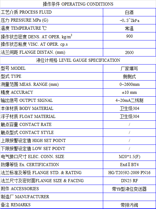 | 1 | 磁翻柱液位计 | 南通恒安 | 食品级304 | DN25,PN16,H=2600 | 3(套) |