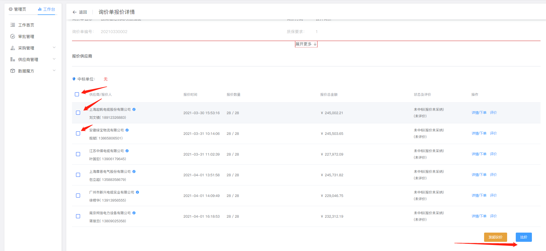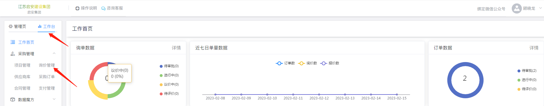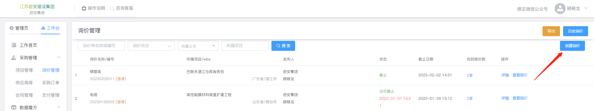 进入系统后点击工作台—询价管理进入创建询价单页面。
