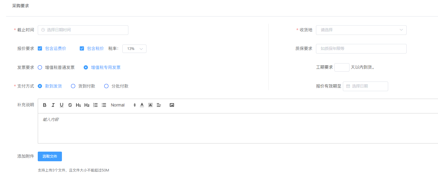 4).询价方式分为3种,①公开报价 ②邀请供应商报价 ③公开加邀请询价(两者兼顾)。其他项目根据企业需求填写。(附件栏可上传图纸)