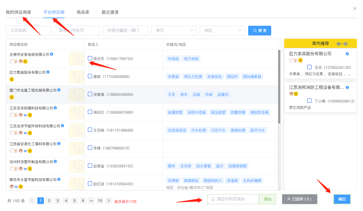 5).邀请供应商有两种模式:启安集团OA库内供应商+启安云平台供应商。可通过直接选取或者搜索公司名称及手机号码选取添加,添加完点击确定。