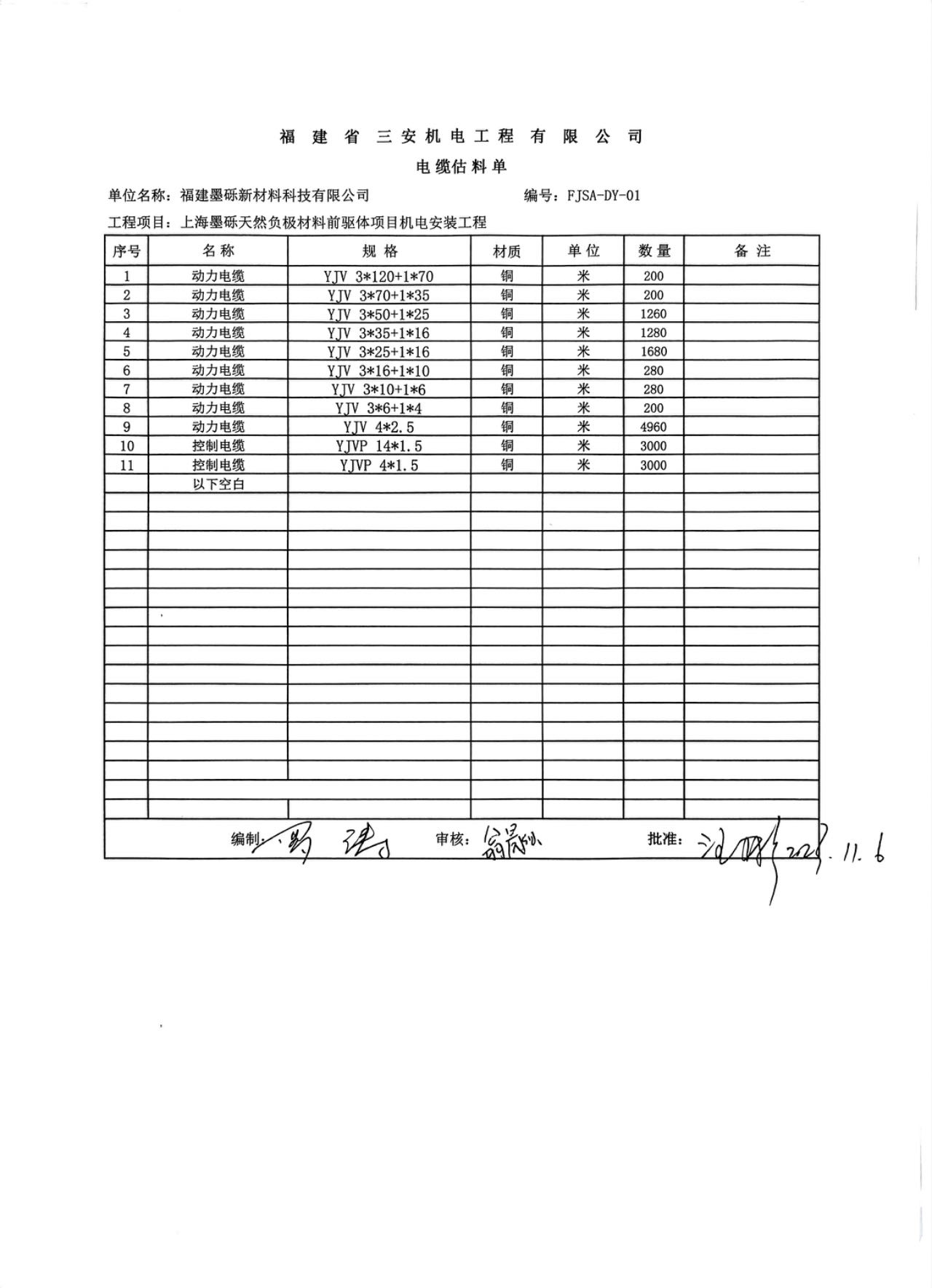 2023.11.7福建墨砾-上海墨砾天然负极材料前驱体项目电缆询价
