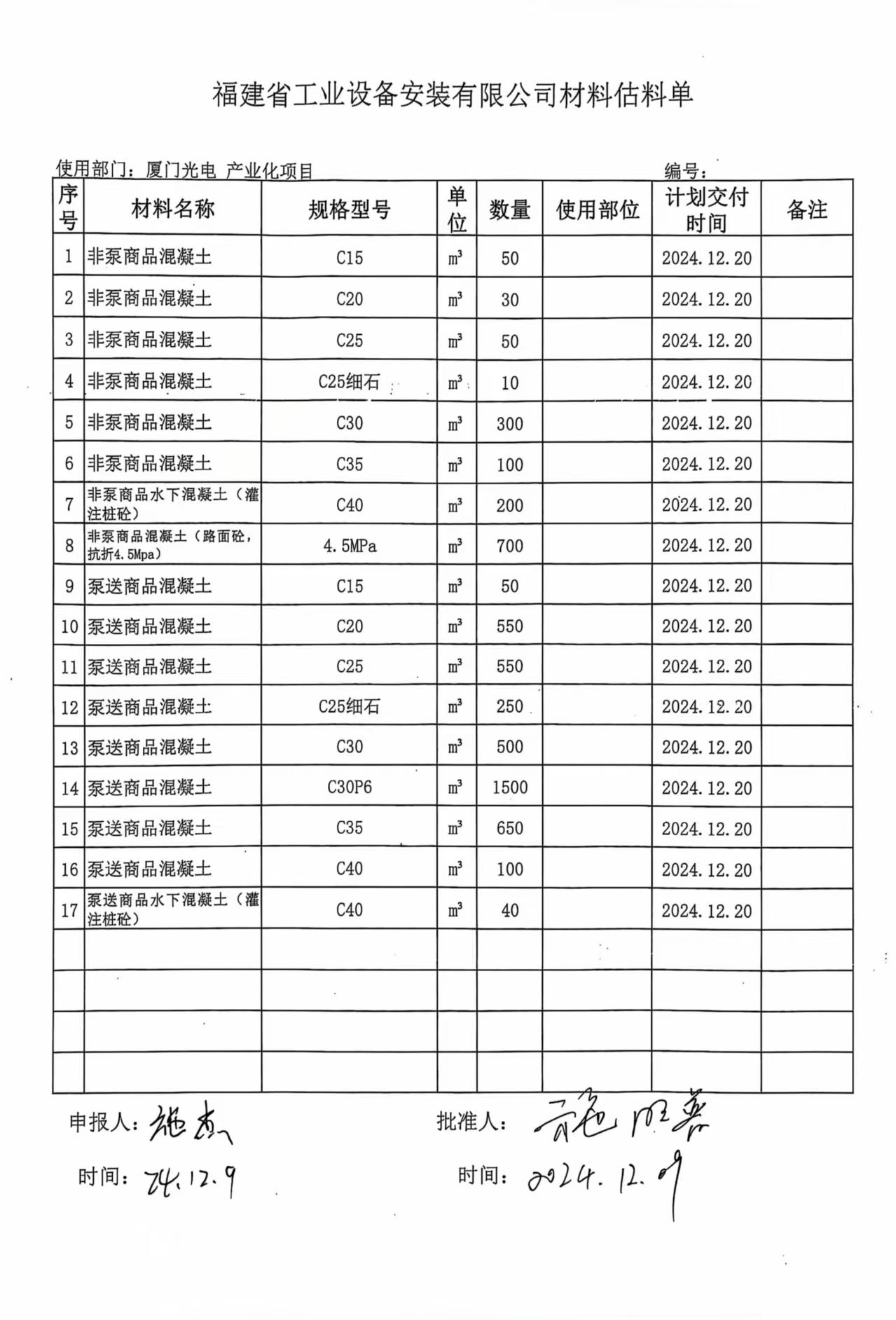 15 | 泵送商品混凝土 | GB/T/14902-2012(预拌混凝土国家标准 | C35 | 650(m³) | 按现行市场价格报价(市场价格应结合2024年12月份“厦门市建设工程造价网”预拌混凝土税后综合价下浮比率备注说明) | ||