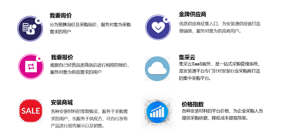 安装通隶属于上海筑网信息科技有限公司,覆盖建筑设备、楼宇安全、消防报警、通风采暖、计算机网络、会议多媒体、住宅智能等细分行业的产品采供和安装设计平台,以满足用户需求和体验为终极目标,依托协会,整合国内安装企业与生产供应商,打通上下游产业链,支持商品采供、项目询价、方案设计、解决方案等特色功能,提供贷款、物流、认证、延保、培训、招标等核心服务。